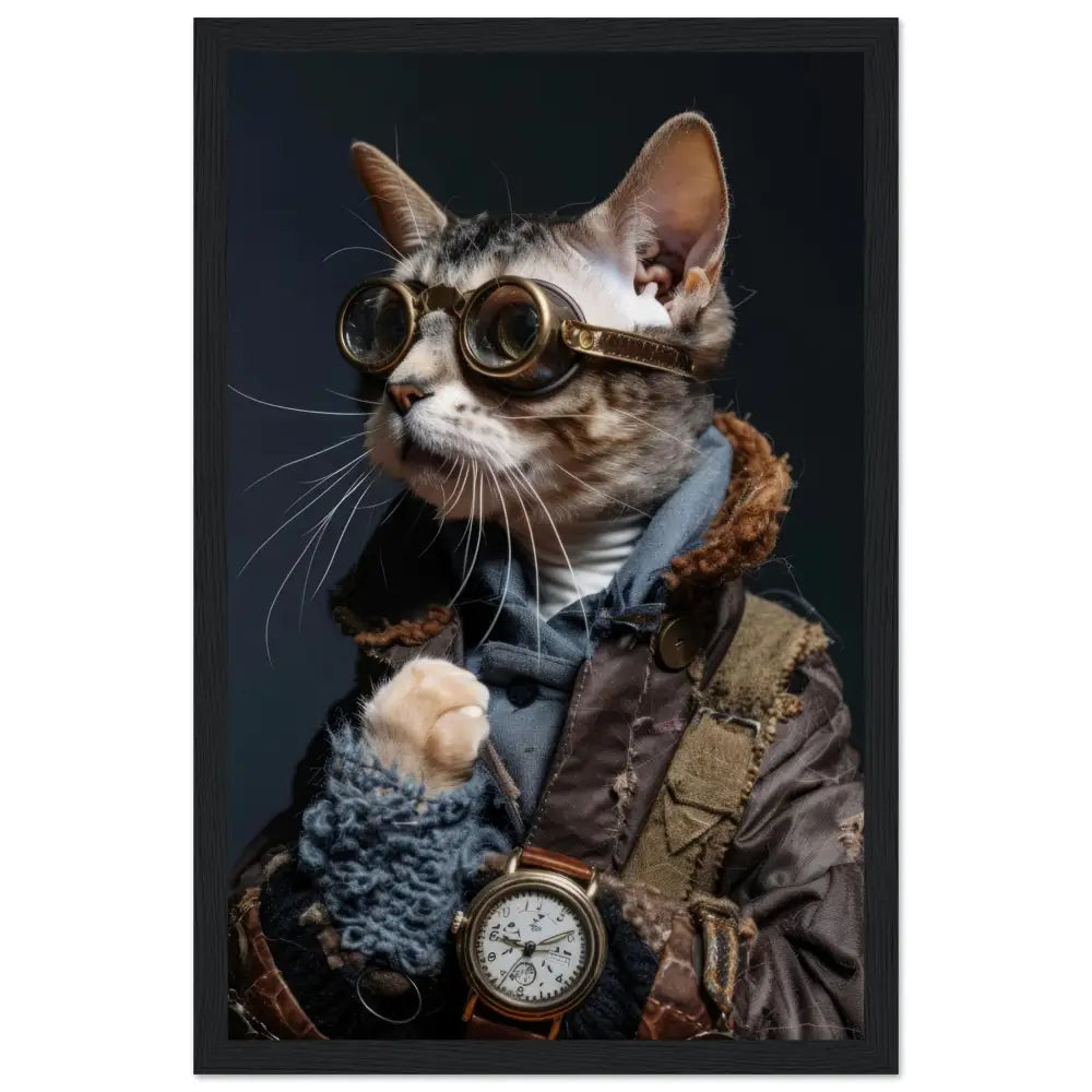 Dit schilderij toont een kat, gekleed in een prachtige vintage steampunk outfit. Hij draagt een stijlvolle, bruine leren jas met delicate patches en verweerde accenten. Om zijn nek hangt een antieke gouden klok, die goed contrasteert met de warme kleurtinten van zijn kleding. Op zijn kop prijken grote, bronskleurige retro-futuristische brillen met ingewikkelde metalen details. Zijn poten zijn voorzien van blauwe, bontachtige manchetjes die het geheel extra elegant maken. De achtergrond is donker en neutraal, wat de aandacht extra vestigt op de gedetailleerde steampunk kleding van de kat.
