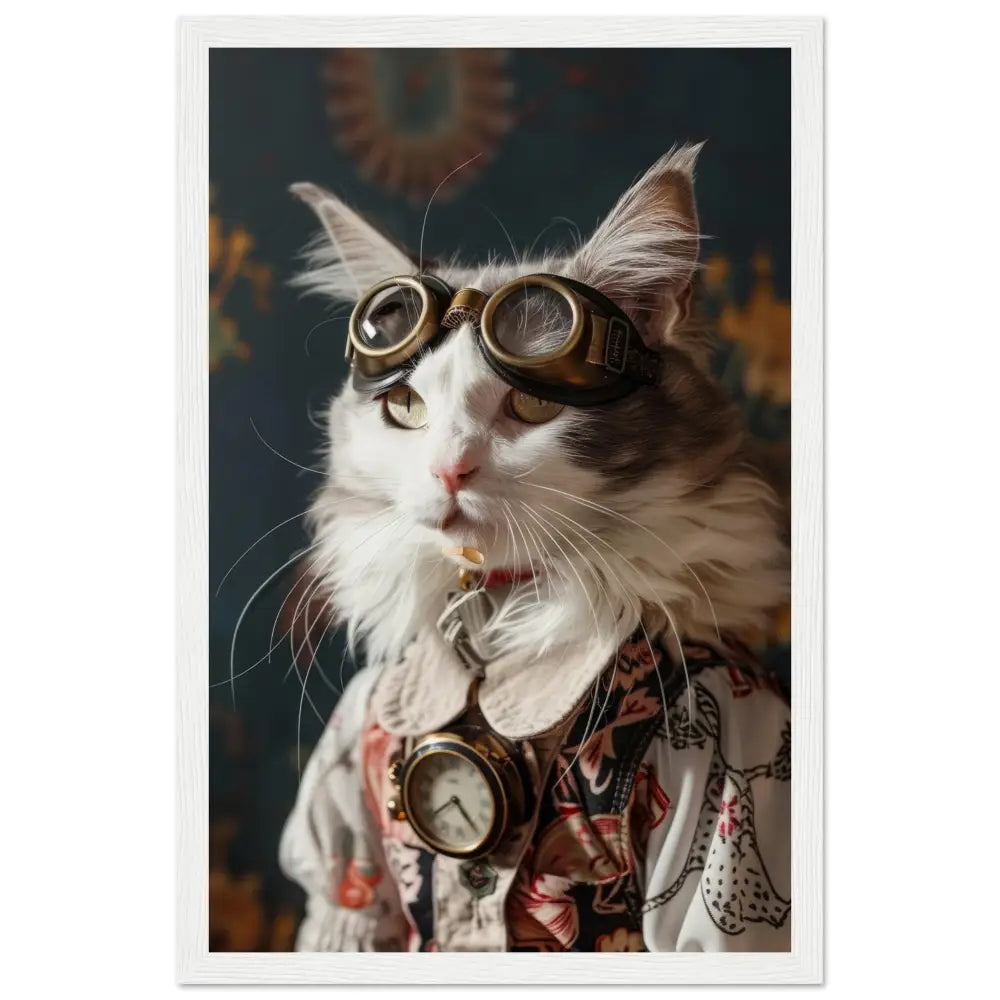 Dit schilderij toont een kat, gekleed in een prachtige steampunk outfit. Ze draagt een elegante, beige jas met gedetailleerde bloemmotieven en subtiele stiksels in rood. Om haar nek hangt een antieke, bronzen klok, die een verfijnde uitstraling geeft. Haar kop wordt gesierd door stoere, bronzen brillen met ingewikkelde metalen details, passend bij de klok. Haar pootjes zijn voorzien van chique, grijze bontachtige manchetjes en leren accenten, die het geheel compleet maken. De achtergrond heeft een nostalgische, bloemenpatroon, wat de klassieke sfeer van het portret versterkt.