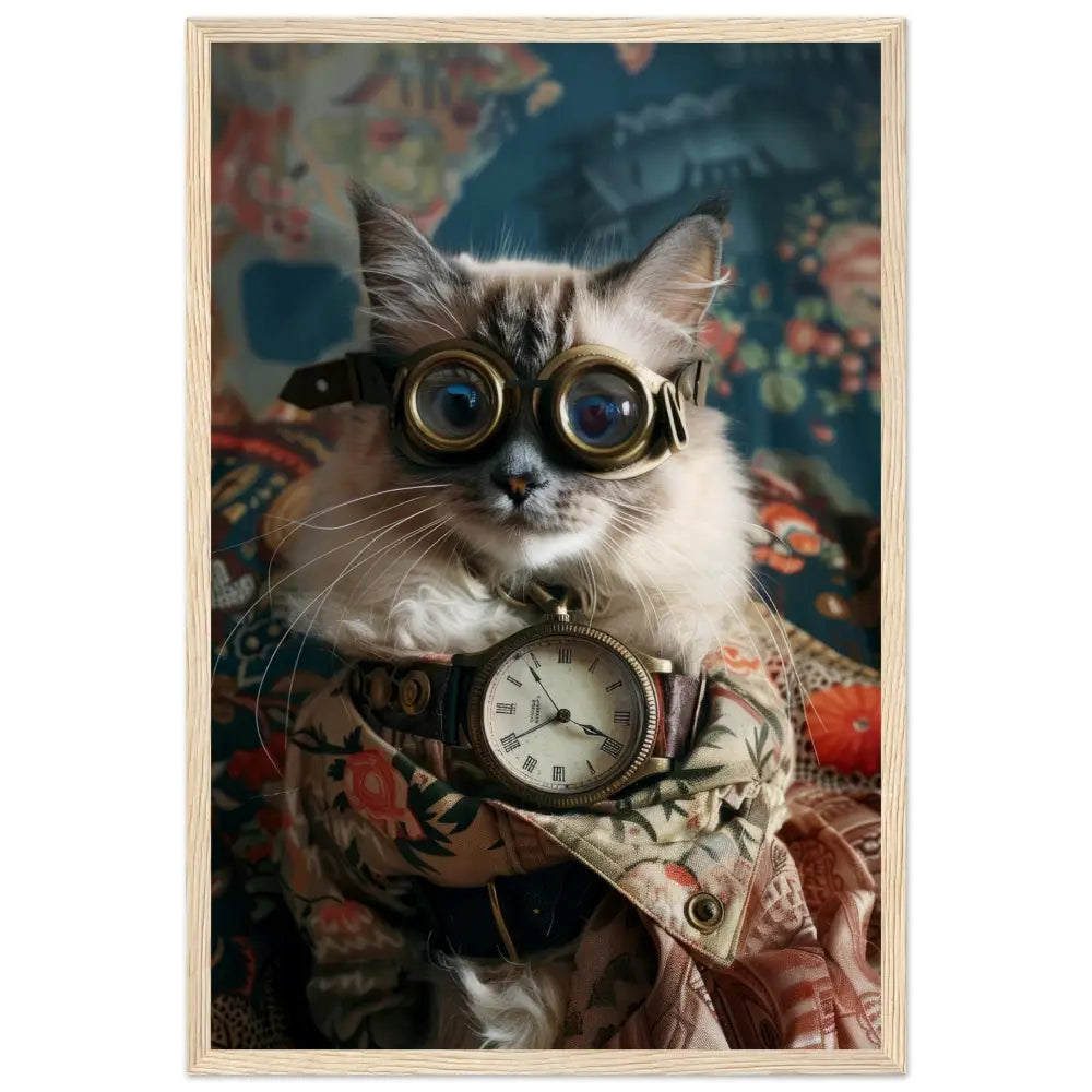 Dit schilderij toont een kat, gekleed in een prachtige vintage steampunk outfit. Hij draagt een rijkelijk gedecoreerde, beige jas met fleurige patronen en delicate accenten. Om zijn nek hangt een antieke bronzen klok, die zijn elegante uitstraling versterkt. Zijn kop is gesierd door een paar grootse, retro-futuristische brillen met metalen details en een gouden kleur, waardoor hij eruitziet als een avontuurlijke ontdekkingsreiziger. Zijn pootjes zijn voorzien van verfijnde, crème bontachtige manchetjes die het geheel afmaken. De achtergrond van Dit schilderij is levendig, met rijke bloemen en industriële elementen, hetgeen de steampunk sfeer versterkt.
