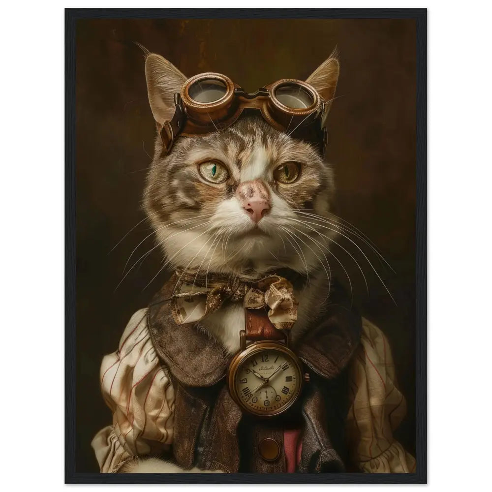 Dit schilderij toont een kat, gekleed in een prachtige vintage steampunk outfit. De kat draagt een elegante, diepbruin lederen jas met subtiele streepjes en versleten accenten, die zijn avontuurlijke uitstraling versterken. Om zijn nek hangt een antieke bronzen klok, die gedetailleerde Romeinse cijfers en ingewikkelde gravures bevat, perfect passend bij zijn chique uiterlijk. Op zijn hoofd prijkt een set retro-futuristische brillen met robuuste, koperkleurige metalen details, die hem een tijdreiziger allure geven. Zijn poten zijn versierd met delicate manchetjes van beige bont en leren accenten, vergezeld van contrasterende rode en witte stiksels. De achtergrond is somber en industrieel, met roestige, mechanische tandwielen die een mysterieuze sfeer creëren.