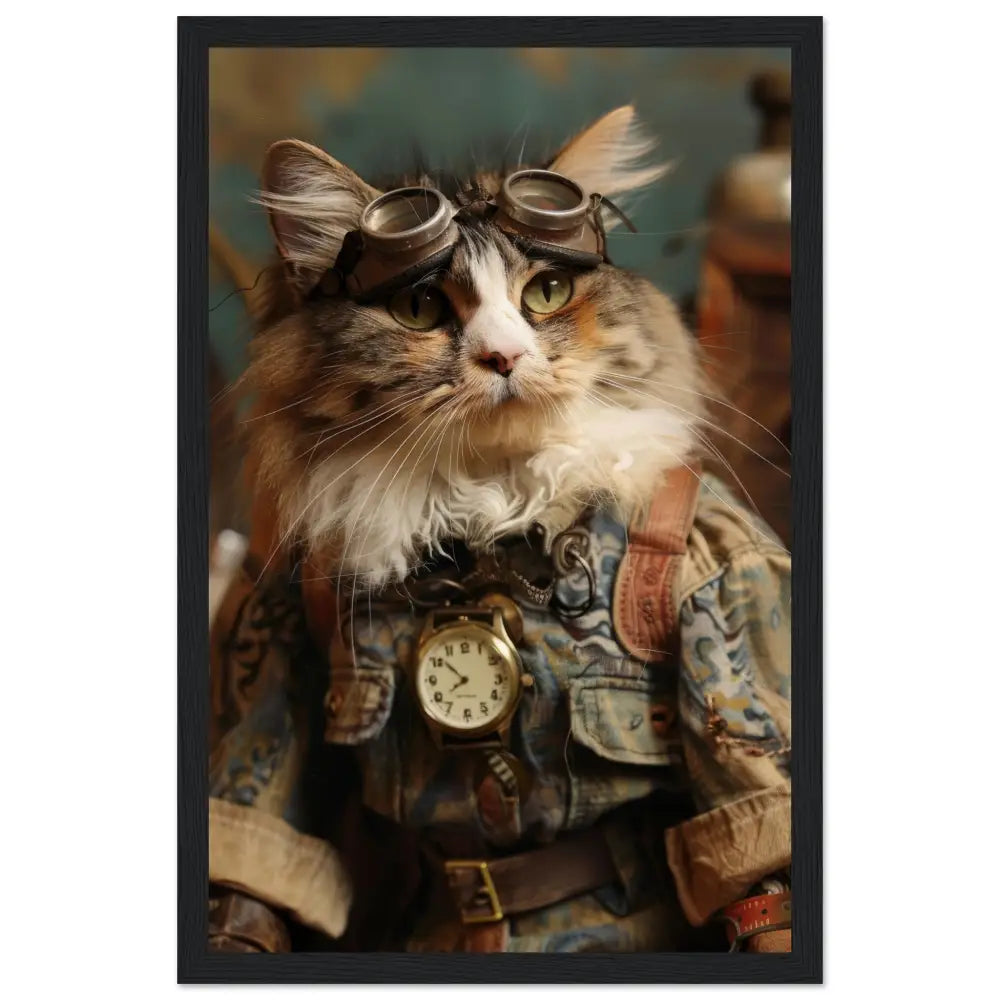 Dit schilderij toont een kat, gekleed in een prachtige vintage steampunk outfit. Ze draagt een kunstig bewerkte jas in blauw en beige tinten met verfijnde patronen en leren accenten. Om haar nek hangt een antieke, goudkleurige klok die haar verfijnde uitstraling versterkt. Op haar hoofd prijkt een paar klassieke, retro-futuristische brillen met bronzen metalen details, wat haar een avontuurlijke uitstraling geeft. Haar pootjes zijn versierd met elegante, beige bontachtige manchetjes die het geheel compleet maken. De achtergrond van Dit schilderij is gedetailleerd met een industriële setting, wat de steampunk-ambiance perfect aanvult.