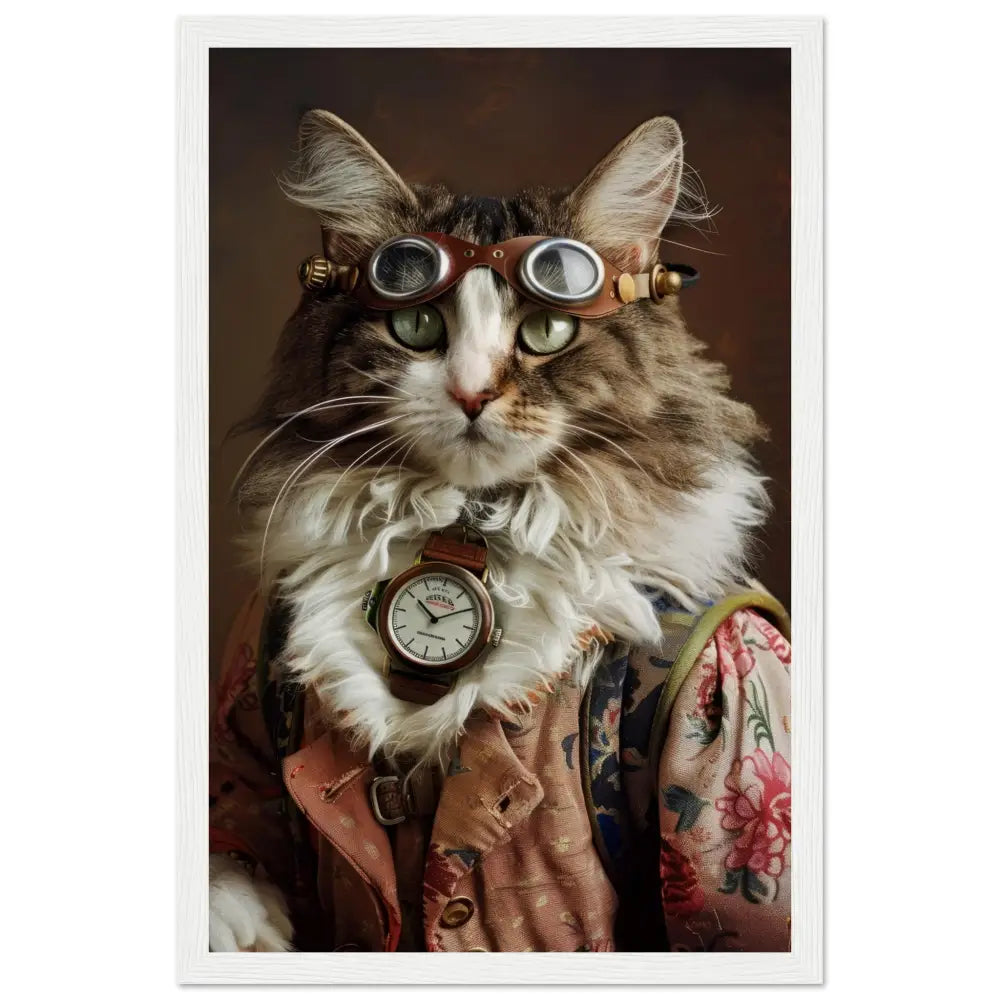 Dit schilderij toont een sierlijke kat, gekleed in een prachtige vintage steampunk outfit. Ze draagt een elegante, vervaagde roze jas met ingewikkelde patronen en fluwelen accenten, die haar aristocratische uitstraling versterken. Om haar nek hangt een antieke bronzen klok, die subtiel contrasteert met haar weelderige vacht. Haar kop is gesierd met een paar grote, retro-futuristische brillen met metalen details in een warme bronskleur, wat haar eruit laat zien als een avontuurlijke tijdreiziger. Haar pootjes zijn voorzien van verfijnde, witte bontachtige manchetjes die het geheel afmaken. De achtergrond heeft een rustieke, bruinachtige tint, die de schoonheid van de kat benadrukt.