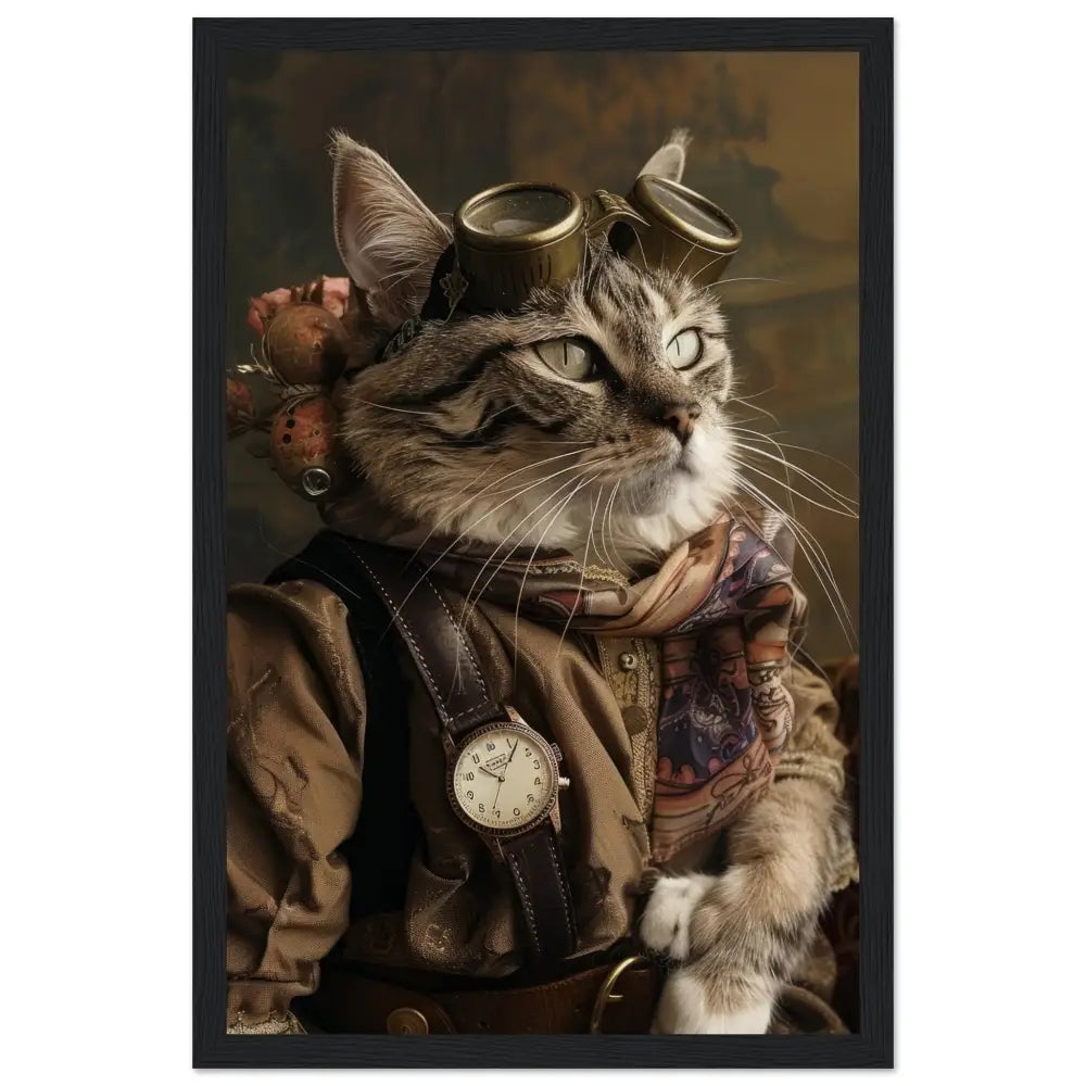 Dit schilderij toont een kat, gekleed in een prachtige vintage steampunk outfit. De kat draagt een elegante, bruin-beige jas met subtiele bloempatronen en bronzen accenten. Om de nek hangt een antieke klok in een diepbruine kleur, die de tijdloze charme van het model benadrukt. Op het hoofd van de kat prijkt een paar stoere, retro-futuristische goggles met metalen details en een antiek gouden kleur. Verder zijn de pootjes voorzien van verfijnde, witte bontachtige manchetjes die het geheel compleet maken. De achtergrond toont een sfeervol, artistiek landschap dat de historische en fantasierijke sfeer van het schilderij versterkt.