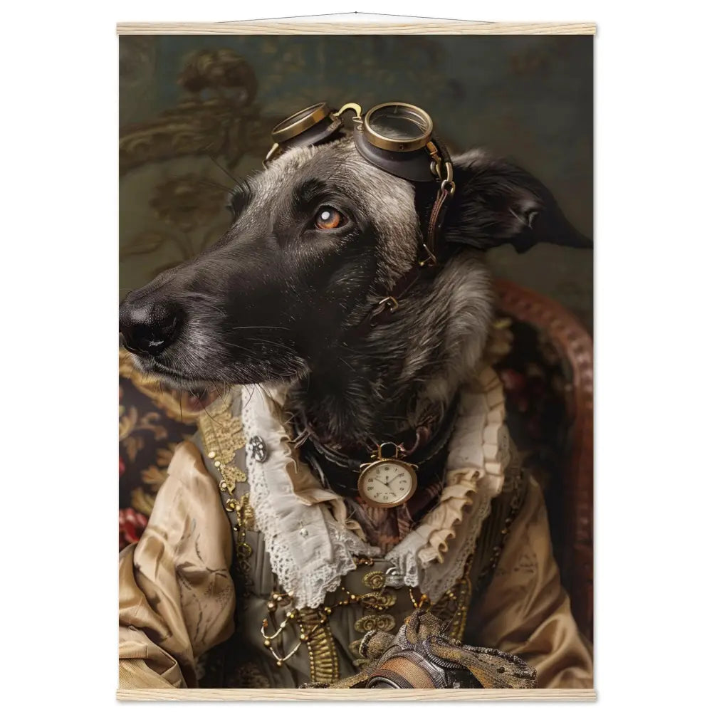 Deze afbeelding toont een dier, gekleed in een prachtige vintage steampunk outfit. Het draagt een elegante, beige jas met verfijnde, goudkleurige patronen en sierlijke knopen. Om de nek hangt een antieke, bronzen klok die perfect past bij het steampunk-thema. De kop wordt gesierd door een paar robuuste, retro-futuristische brillen met metalen details in een warme bruintint, wat de avontuurlijke uitstraling versterkt. De pootjes zijn voorzien van stijlvolle, bruine leren accenten en contrasterende stiksels die het geheel compleet maken. De achtergrond is gedetailleerd met barokke motieven, wat een historische sfeer toevoegt aan het portret.