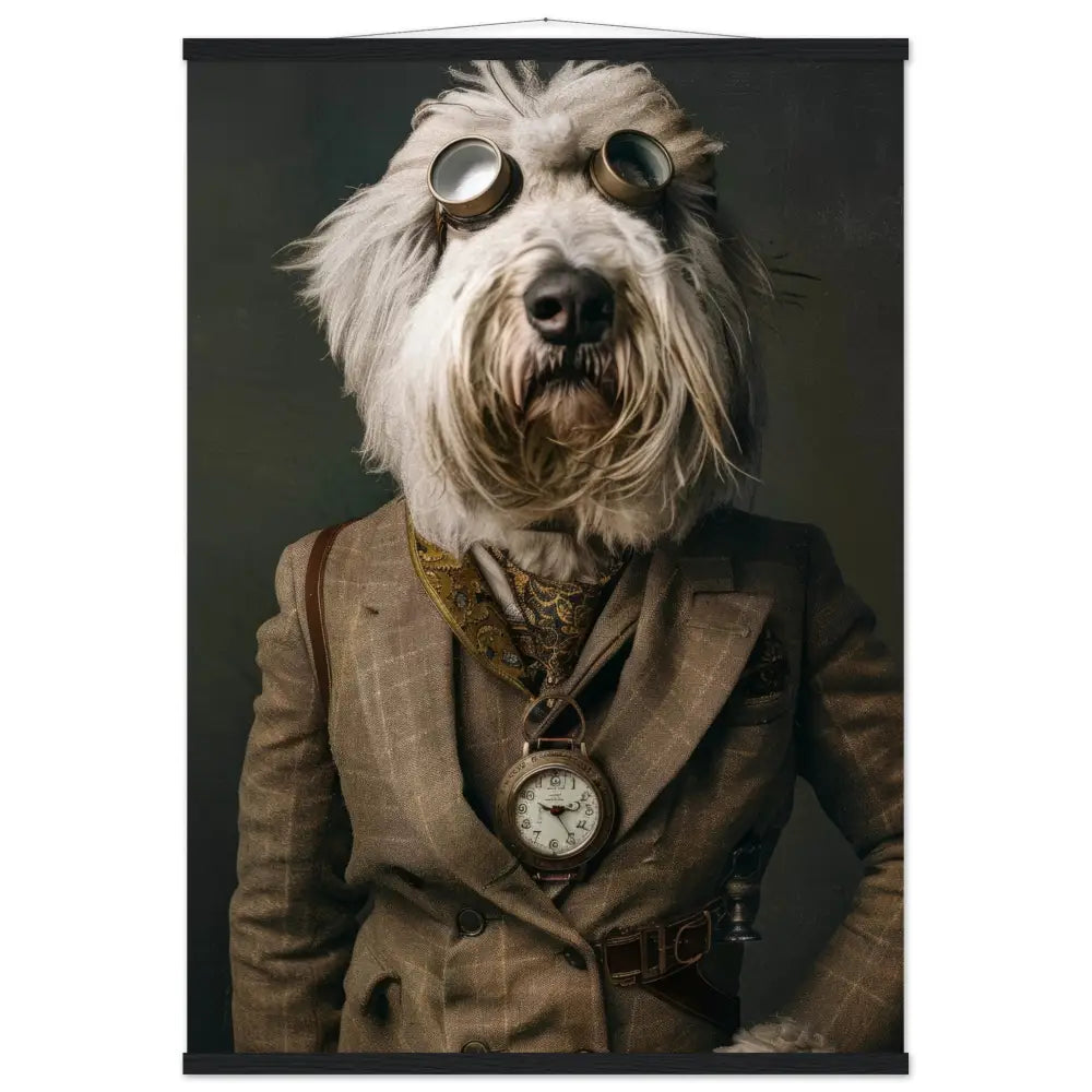 Deze afbeelding toont een dier, gekleed in een prachtige vintage steampunk outfit. Dit dier draagt een elegant, bruin-gestreepte jas met subtiele patronen en gouden accenten. Om de nek hangt een antieke, bronzen klok, die de klassieke uitstraling versterkt. Op het hoofd prijkt een retro-futuristische bril met zilverkleurige metalen details, wat de tijdreiziger-aspect benadrukt. De pootjes zijn voorzien van zachte, crèmekleurige bontmanchetjes die het geheel verfijnen. Leren accenten en contrasterende stiksels completeren de look, terwijl de achtergrond een mysterieuze, vervaagde groene tint heeft, wat het steampunk-thema versterkt.