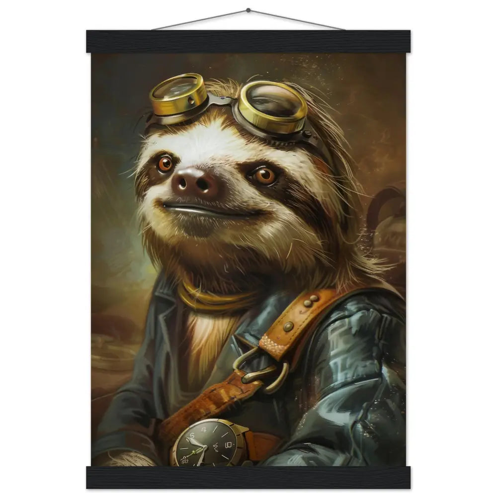 Deze afbeelding toont een dier, gekleed in een prachtige vintage steampunk outfit. Het draagt een stijlvolle, donkerblauwe jas met subtiele, glanzende patronen en leren accenten. Om de nek hangt een antieke bronzen klok, die de tijdloze uitstraling versterkt. De kop wordt gesierd door een paar robuuste, retro-futuristische brillen met metalen details in goudkleur, wat het geheel een avontuurlijke uitstraling geeft. De pootjes zijn voorzien van elegante, beige bontachtige manchetjes, die het steampunk thema compleet maken. De achtergrond is gevuld met gedempte, industriële tinten die de historische sfeer van de afbeelding benadrukken.