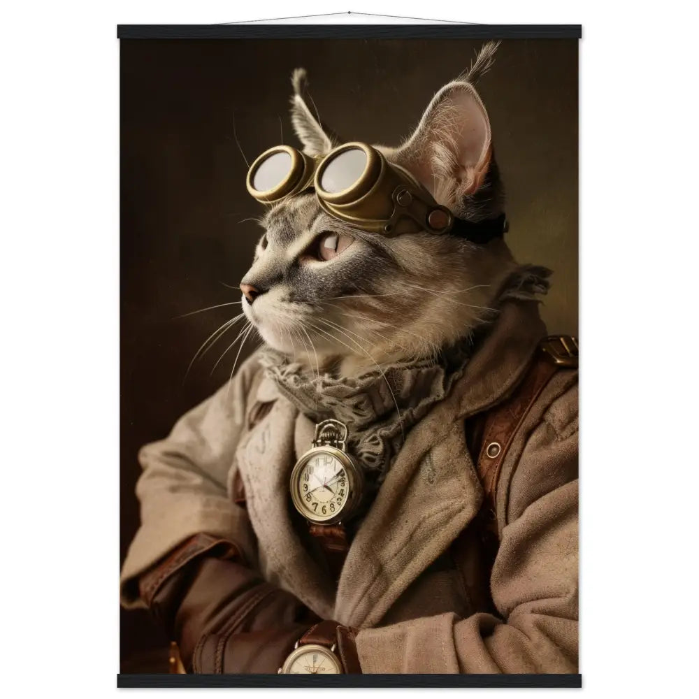 Dit schilderij toont een majestueuze kat, gekleed in een prachtige vintage steampunk outfit. De kat draagt een elegante beige jas met verfijnde stiksels en subtiele leren accenten. Om haar nek hangt een antieke zilveren klok, die een gevoel van tijdloze elegantie toevoegt. Op haar hoofd prijkt een set bronzen steampunk-brillen met gedetailleerde metalen afwerkingen, die haar een avontuurlijke uitstraling geven. Haar pootjes zijn versierd met stijlvolle bruin-leren manchetjes die het geheel samenbrengen. De achtergrond van de portret is een donkere, rustieke muur met een ietwat verweerde textuur, wat de nostalgische sfeer van de afbeelding versterkt.