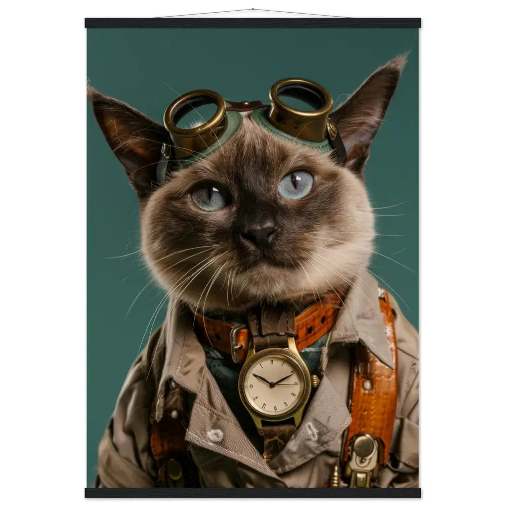 Dit schilderij toont een prachtige kat, gekleed in een stijlvolle vintage steampunk outfit. Ze draagt een elegante, beige jas met subtiele patronen en leren accenten. Om haar nek hangt een antieke gouden klok, die extra charme toevoegt aan haar verschijning. Haar kop wordt gesierd door een paar robuuste, retro-futuristische brillen met metalen details in bronstinten, wat haar het uiterlijk geeft van een ontdekkingsreiziger. Haar pootjes worden nog verder geaccentueerd door zachte, bruine leren accenten die het geheel compleet maken. De achtergrond is een eenvoudige groene tint, wat de blik volledig op de gedetailleerde outfit en de kat richt.