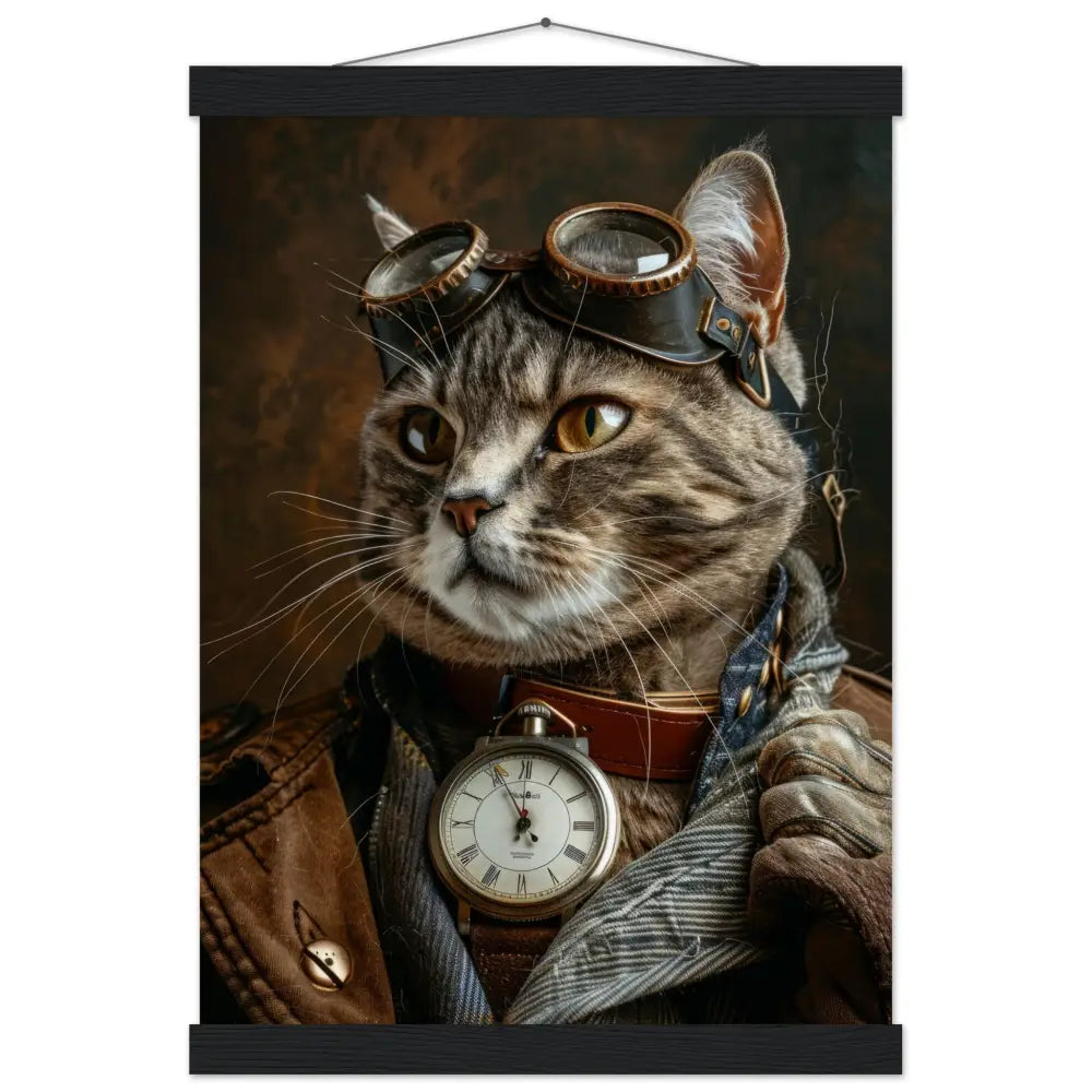 Dit schilderij toont een kat, gekleed in een prachtige vintage steampunk outfit. Ze draagt een stijlvol, bruine jas met subtiele stiksels en leren accenten. Om haar nek hangt een antieke zilveren klok, die elegant contrasteert met haar vacht. Haar kop wordt gesierd door een paar grote, retro-futuristische brillen met metalen details in bronskleur, waardoor ze een avontuurlijke uitstraling heeft. Haar poten zijn voorzien van bontachtige manchetjes die de look compleet maken. De achtergrond van dit kunstwerk is rijkelijk gedetailleerd met industriële tonen, wat een nostalgische en authentieke steampunk sfeer creëert.