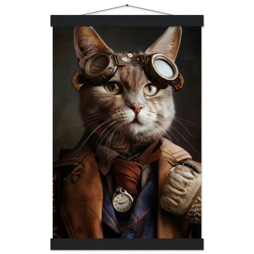 Dit schilderij toont een kat, gekleed in een prachtige vintage steampunk outfit. Hij draagt een donkerbruine jas met subtiele kruissteekkoppelingen en rafelige randen. Om zijn nek hangt een antieke zakhorloge met een verzilverde kast die elegant de tijd aangeeft. Zijn hoofd wordt gesierd door een paar grote, ronde goggles met bronzen metalen details en heldere glazen. Zijn pootjes zijn getooid met vormvaste, leren manchetjes die een robuuste uitstraling geven. De achtergrond van de afbeelding is donker en industrieel, wat perfect contrasteert met de rijke texturen en accenten van de kleding van deze avontuurlijke kat.
