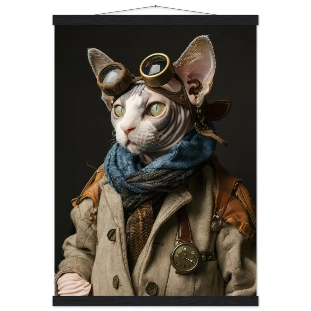 Dit schilderij toont een majestueuze sfinxkat, gekleed in een prachtige vintage steampunk outfit. Hij draagt een stijlvolle beige jas met subtiele streepdetails en verweerde leeraccenten. Om zijn nek hangt een antieke bronzen klok, die zijn tijdloze elegantie benadrukt. Zijn hoofd wordt bekroond door een robuuste bril met bronzen metalen details en donkere glazen, wat hem een avontuurlijke en geheimzinnige uitstraling geeft. Aan zijn pootjes prijken ingetogen leren manchetjes die het geheel flair geven. De sobere, donkere achtergrond zorgt ervoor dat zijn indringende blik en gedetailleerde outfit de volledige aandacht trekken.