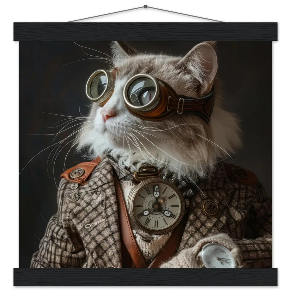 Dit schilderij toont een kat, gekleed in een prachtige vintage steampunk outfit. De kat draagt een elegante, bruin geruite jas met subtiele, leerachtige accenten en bloemvormige knopen. Om de nek hangt een antieke gouden klok die de tijdloze charme van het geheel versterkt. Het hoofd van de kat wordt geaccentueerd door een paar opvallende, bronzen retro-futuristische brillen met verfijnde metalen details, die een avontuurlijke uitstraling geven. De voorpootjes zijn prachtig versierd met wollige, crèmekleurige manchetjes die voor extra flair zorgen. De achtergrond geeft een sombere, mysterieuze sfeer weer, wat perfect past bij het steampunk-thema van dit portret.