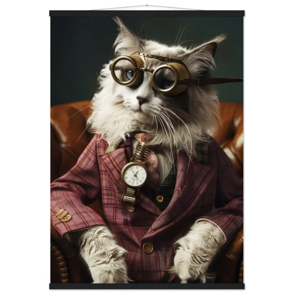 Dit schilderij toont een kat, gekleed in een prachtige vintage steampunk outfit. Ze draagt een elegante, bordeauxrode jas met subtiele ruitpatronen en gouden knopen. Om haar nek hangt een antieke zilveren klok, die prachtig contrasteert met de diepe kleuren van haar kleding. Haar kop wordt gesierd door een set grote, retro-futuristische brillen met bronzen metalen details, perfect passend bij haar avontuurlijke uitstraling. Haar poten zijn versierd met zachte, witte bontachtige manchetjes, die de look compleet maken. De achtergrond heeft een klassieke, leren stoel en donkere tinten, die de romantische sfeer van de afbeelding versterken.