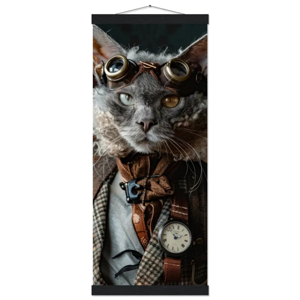 Dit schilderij toont een majestueuze kat, gekleed in een prachtige vintage steampunk outfit. Hij draagt een elegante, geruite jas met subtiele patronen en leren accenten. Om zijn nek hangt een antieke, zilveren klok, die zijn aristocratische uitstraling versterkt. Zijn kop wordt gesierd door een paar grote, retro-futuristische brillen met metalen details in bronskleur, waardoor hij eruitziet als een avontuurlijke tijdreiziger. Zijn pootjes zijn voorzien van sierlijke, grijze bontachtige manchetjes die het geheel afmaken. De afbeelding is geplaatst voor een weelderige achtergrond met subtiel bloemenbehang dat de romantische sfeer benadrukt.