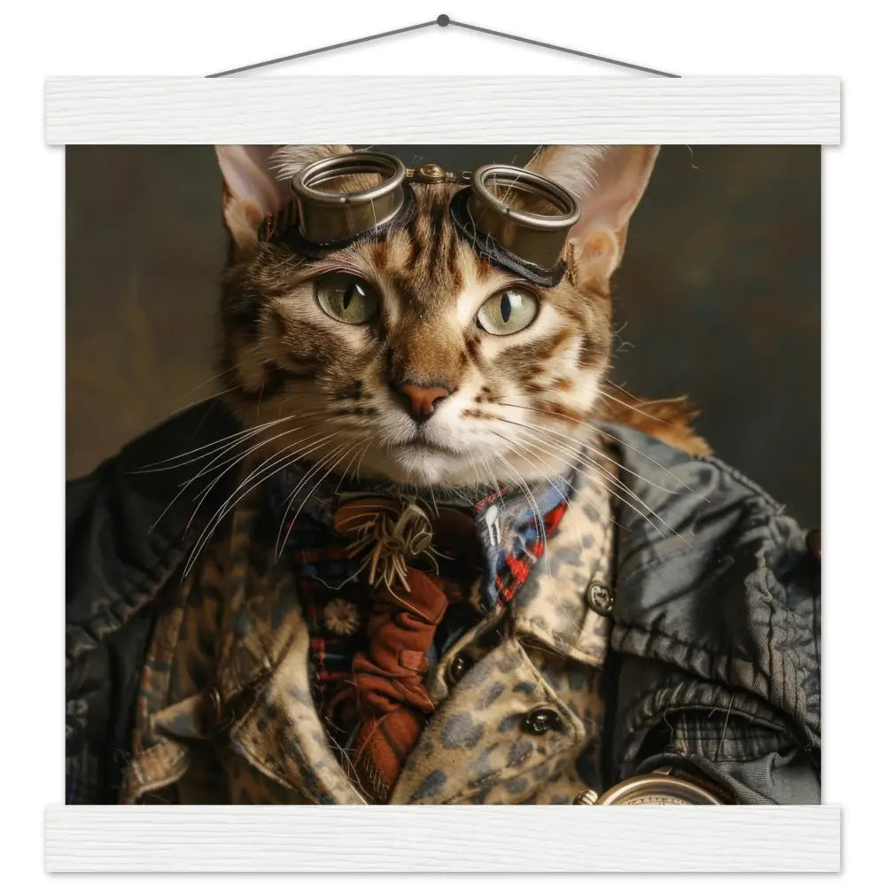 Dit schilderij toont een kat, gekleed in een prachtige vintage steampunk outfit. Ze draagt een elegante jas met een luipaardpatroon en ingewikkelde knoopdetails, waardoor de donkere tinten prachtig contrast geven. Om haar nek hangt een antieke gouden klok, die haar stijlvolle verschijning benadrukt. Haar kop wordt gesierd door een paar opvallende, retro-futuristische brillen met metalen details in zilverkleur, die haar een avontuurlijke en mysterieuze uitstraling geven. Haar pootjes zijn voorzien van zachte, grijze bontachtige manchetjes en leren accenten met contrasterende stiksels, wat het geheel afmaakt. De achtergrond is zacht en vaag, waardoor de kat volledig in de schijnwerpers staat.