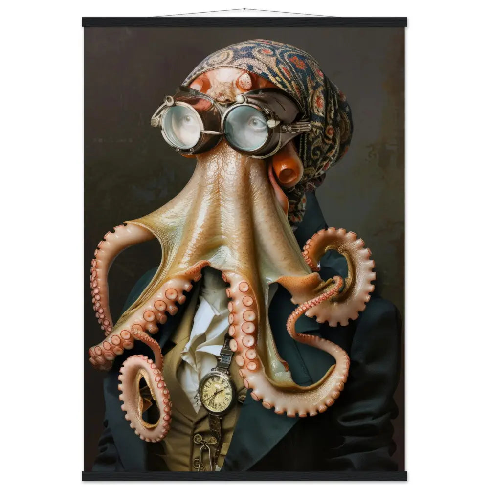 Deze afbeelding toont een dier, gekleed in een prachtige vintage steampunk outfit. Het draagt een elegante, donkerblauwe jas met subtiele glinsterende accenten die een verfijnde uitstraling geven. Om de nek hangt een antieke gouden klok, die een vleugje victorianisme toevoegt aan de look. De kop is uitgerust met een paar robuuste, retro-futuristische brillen, versierd met zilveren metalen details die een industrieel gevoel oproepen. Ter aanvulling zijn de tentakels omgeven door fijne leren riempjes en sierlijke stiksels. De achtergrond is subtiel en geeft een mystieke uitstraling, waardoor de focus op het prachtig uitgedoste dier blijft.