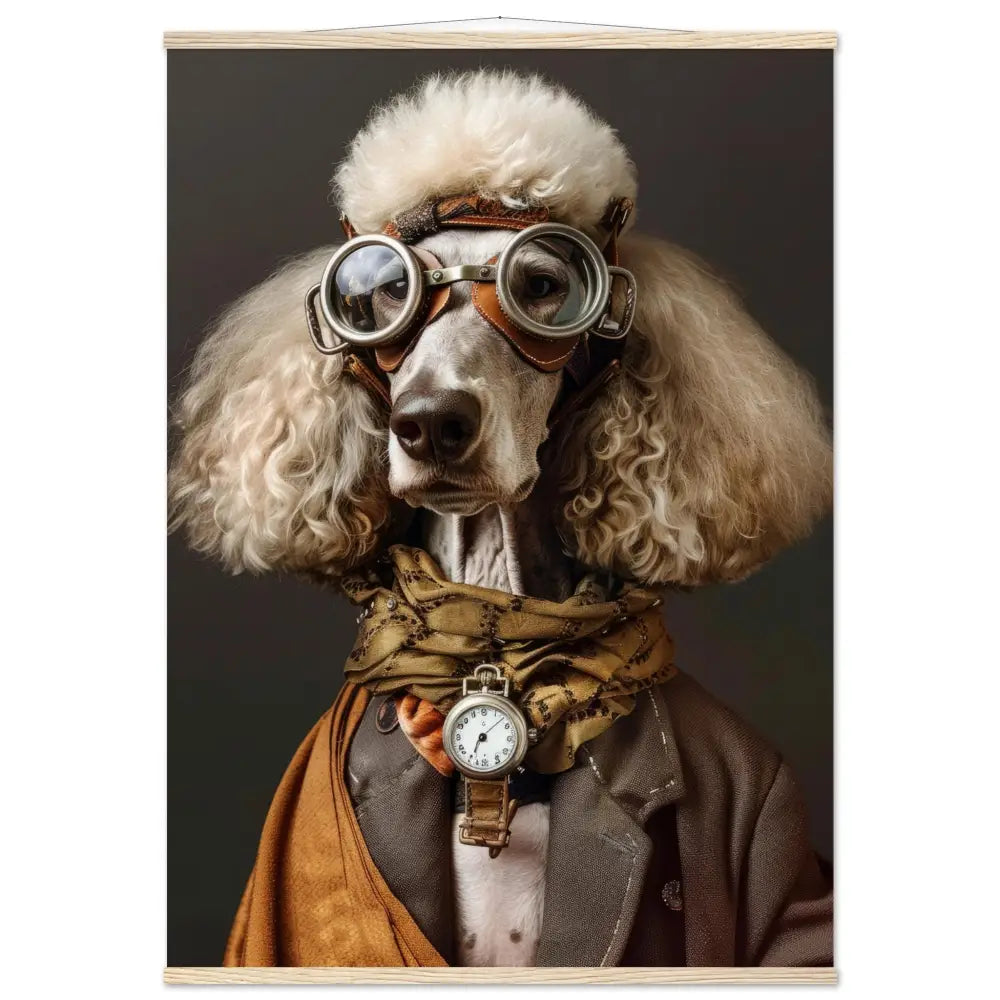 Deze afbeelding toont een dier, gekleed in een prachtige vintage steampunk outfit. Het draagt een elegante, bruin-beige jas met subtiele patronen en geraffineerde accenten. Om de nek hangt een antieke, zilveren klok met een lederen riem, die de aristocratische uitstraling versterkt. De kop wordt gesierd door een paar grote, retro-futuristische brillen met metalen details in bronzen tinten, waardoor deze eruitziet als een avontuurlijke tijdreiziger. De pootjes zijn voorzien van stijlvolle, lichtbruine bontachtige manchetjes die het geheel afmaken. De achtergrond is eenvoudig gehouden, met een donkere, neutrale kleur die de focus op het dier legt.