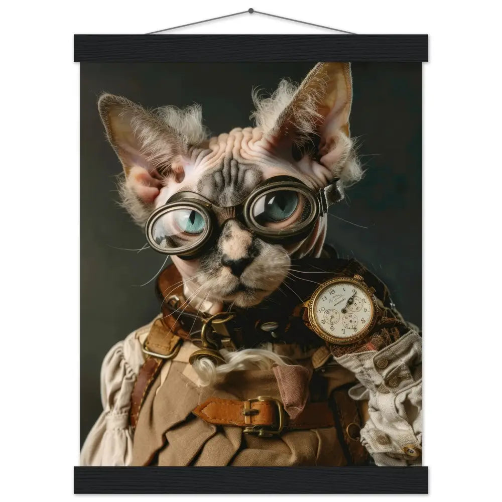 Dit schilderij toont een kat, gekleed in een prachtige vintage steampunk outfit. De kat draagt een stijlvolle, zandkleurige jas met verfijnde patronen en leren accenten. Om zijn nek hangt een antieke gouden klok die zijn tijdloze charme benadrukt. Op zijn kop prijkt een paar grote, retro-futuristische brillen met bronzen metalen details, perfect passend bij het steampunk-thema. Zijn pootjes zijn voorzien van elegante, crèmekleurige bontachtige manchetjes die het geheel helemaal afmaken. De achtergrond van de afbeelding is een donkere, mysterieuze setting die een mooi contrast biedt met de gedetailleerde en kleurrijke outfit van de kat.